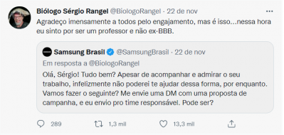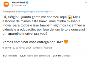 O fato é que, essa resposta da Samsung, além de repercutir de forma negativa para a marca, gerou uma onda muito positiva a favor da Xiaomi que, tendo enviado um celular ao biólogo, ganhou postagens mostrando a desenvoltura da câmera e ainda criou uma imagem extremamente positiva a todo o público do Twitter que acompanhou o caso.
